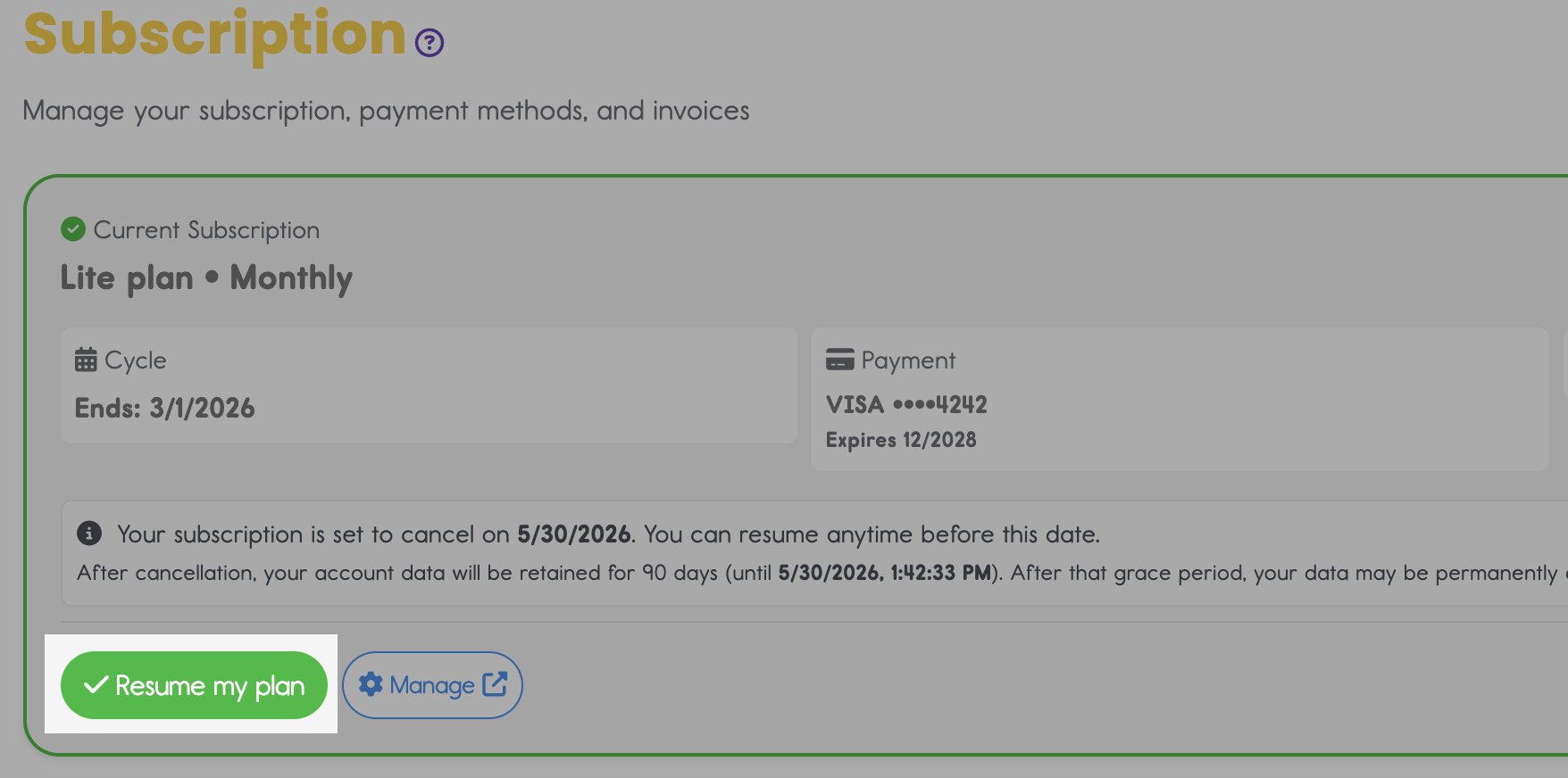 - Before your billing period ends, you can click "Resume my plan" to continue your subscription