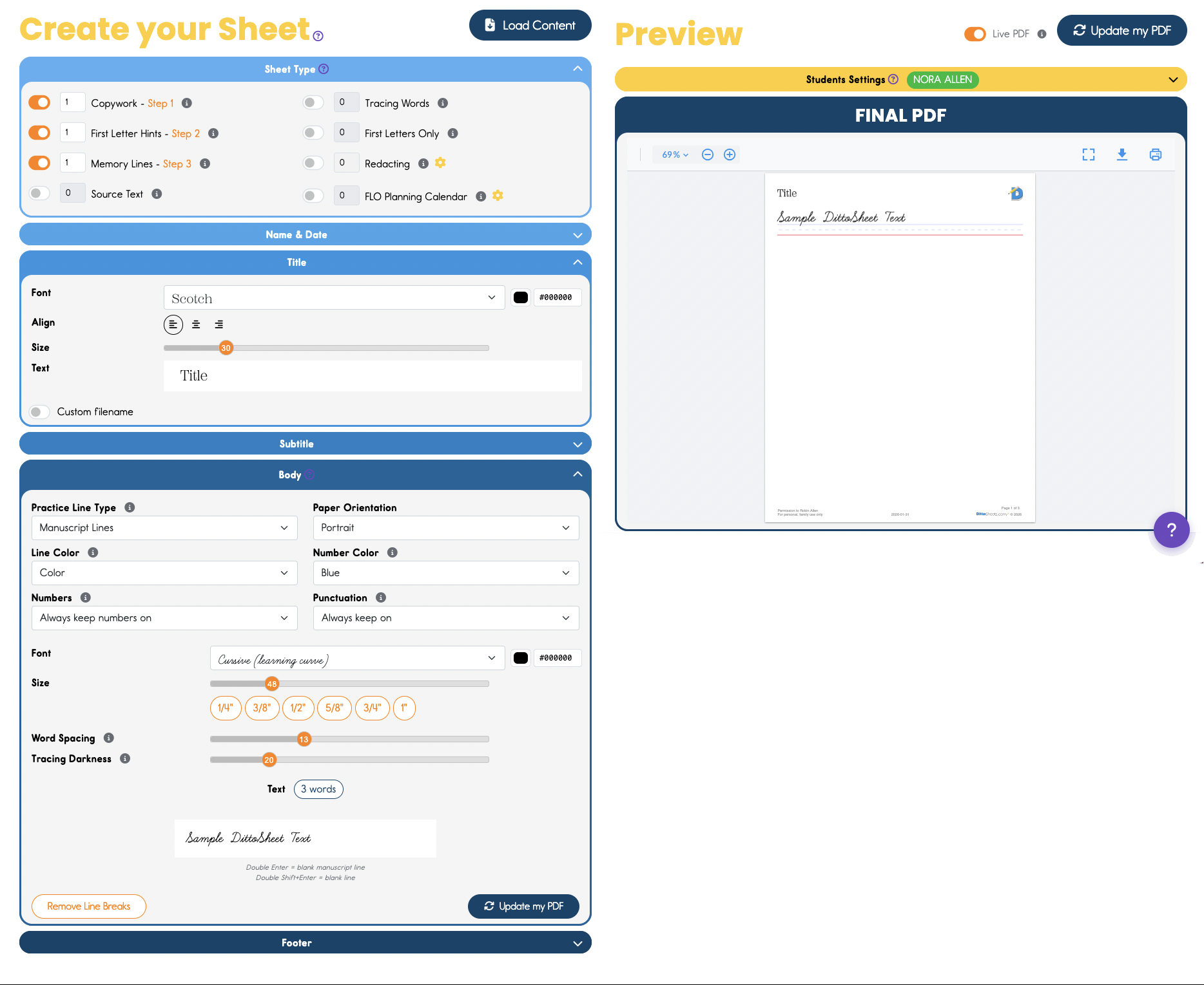This simple Sheet Builder creates Sheets with the basic format of... Name&Date, Title, Subtitle, Body, and Footer. (all but the footer can be turned off.)