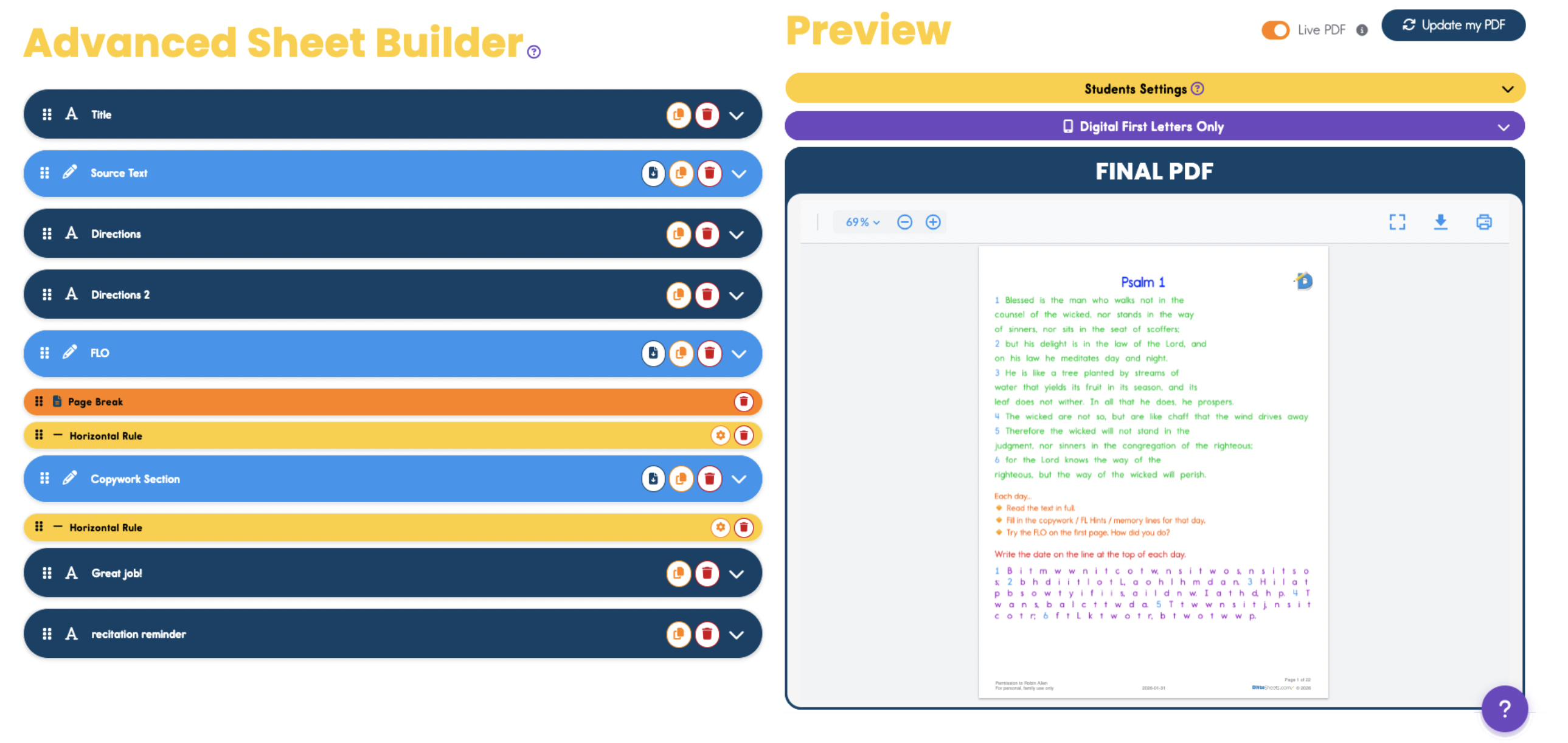 The Advanced Sheet Builder is a Plus-tier feature that transforms worksheet creation from a single-page experience into a powerful multi-section document builder. While the simple Sheet Builder creates one practice type at a time, the Advanced Builder lets you combine multiple sections, each with its own content and settings, into a single cohesive worksheet.