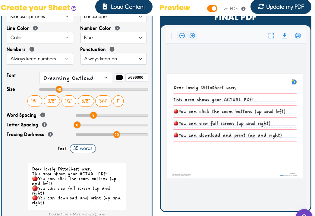 Before downloading your worksheet, you will want to preview it to ensure everything looks correct. DittoSheets provides a live preview that updates as you make changes.